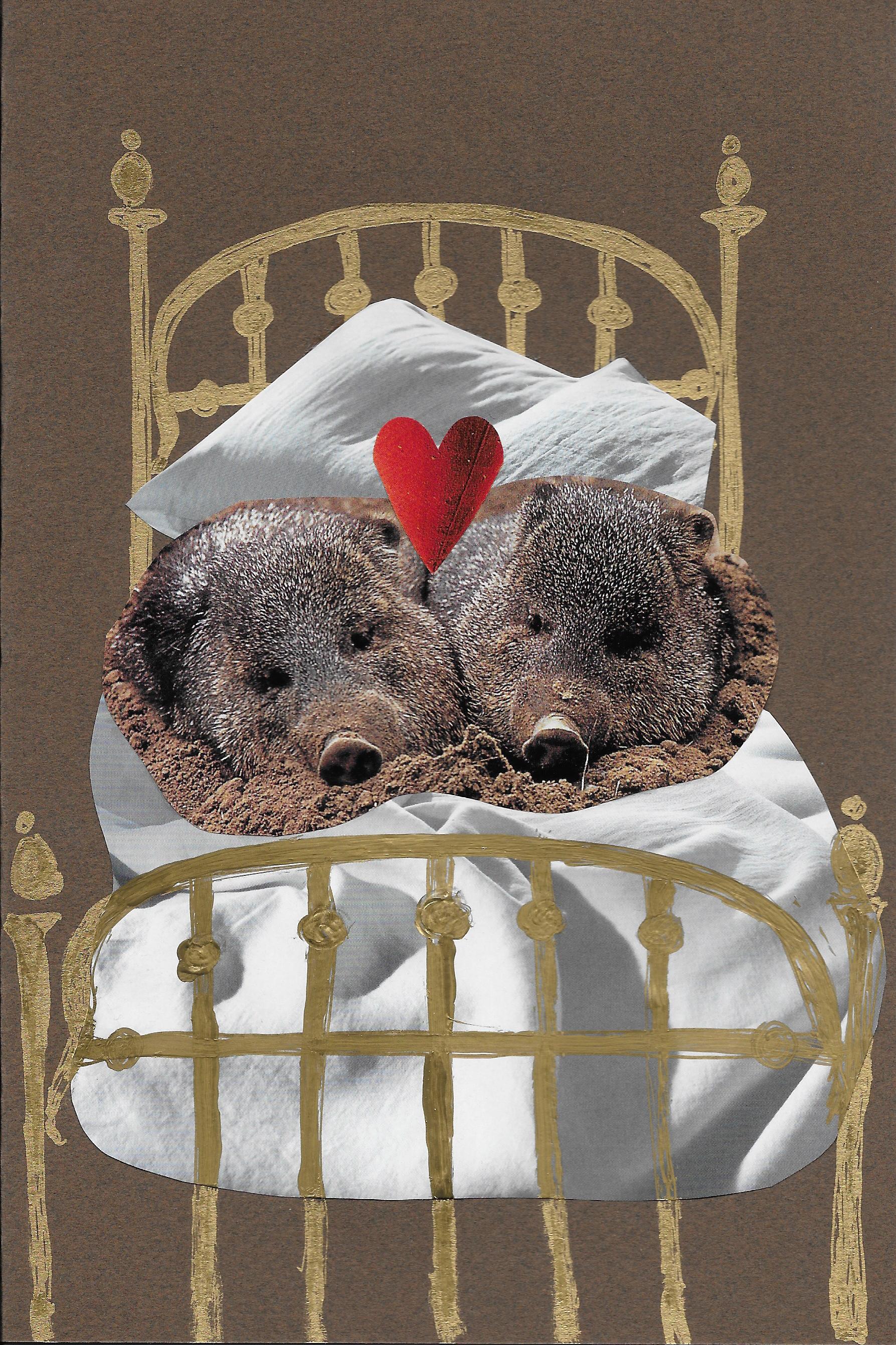 I’m not real consistent about getting greeting cards made. Sometimes I just can’t think of a good idea. Sometimes I just want to buy a card. Or I never get around to it. Or all of the above. But sometimes I pull through with a winner like this one. It’s an anniversary card I made for Spence and Tuyen a while ago. I found this cute picture of a pair of javelinas huddled in the dirt to keep warm in a National Geographic magazine and decided to use it since it reminded me of them. In a super nice way of course! The white bedding is cut from magazine pics. Drew the brass bed with a gold metallic pen. Aren’t they the cutest animals ever? Aside from YOUR pets of course.