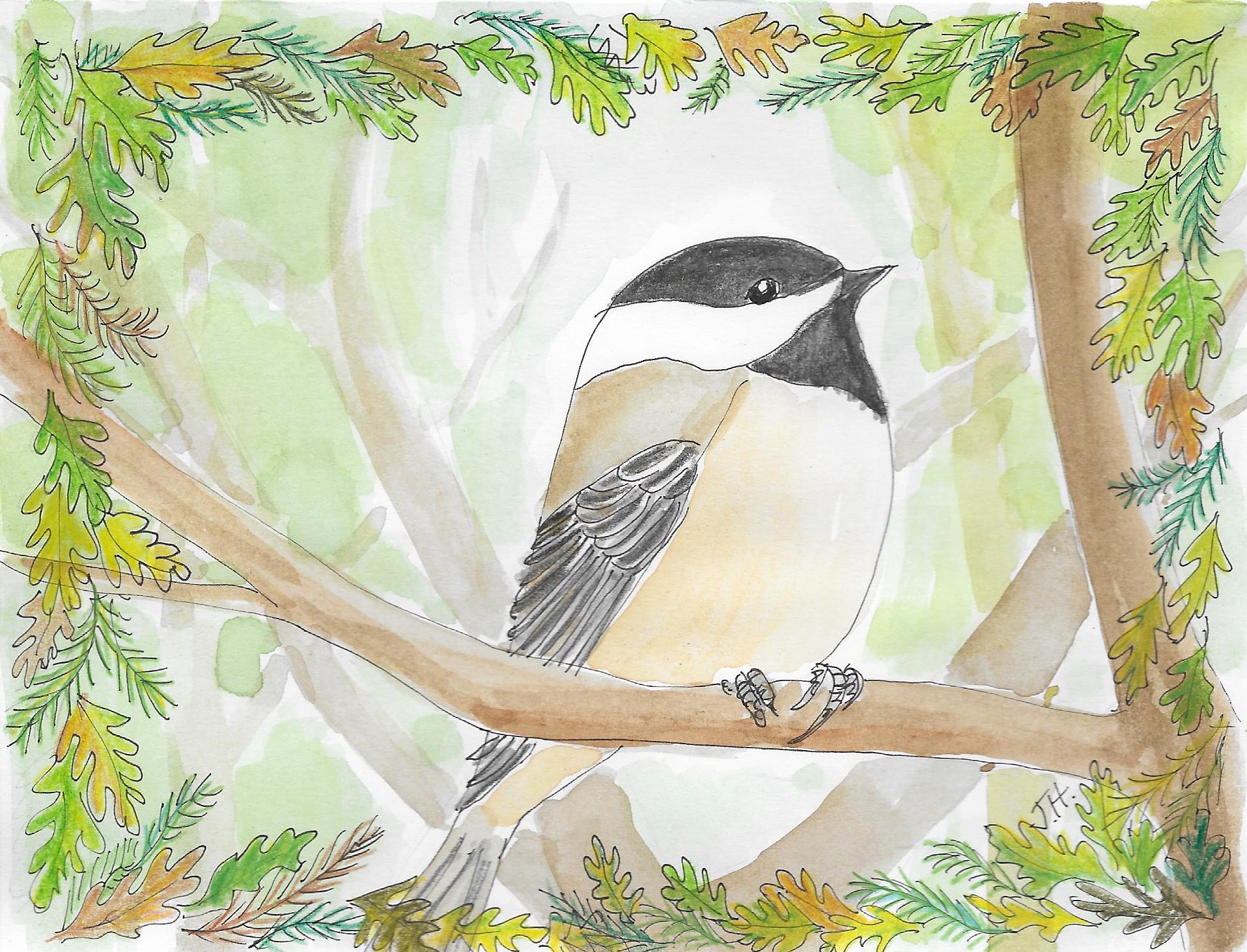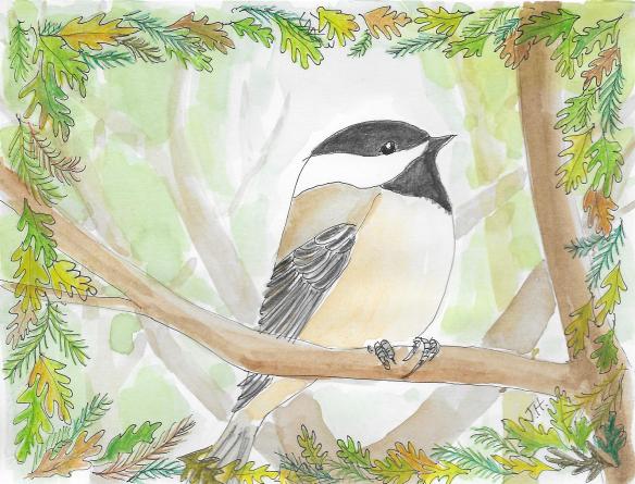 Such a delightful bird! Playful and bold. They seem to enjoy their birdness, you know? The way they dip and swoop as they fly. Anyway, I always felt it would be too hard to draw or paint birds since they are so precise–their markings and smooth feathers. But then I remembered that it doesn’t have to be perfect, just give it a try. I’m not illustrating a bird book. Don’t be afraid. All that stuff. This card was drawn with a micron pen and watercolor. Sam said if he had to pick a favorite non-human creature, it would be a chickadee. Good choice. Happy Birthday, Sam!