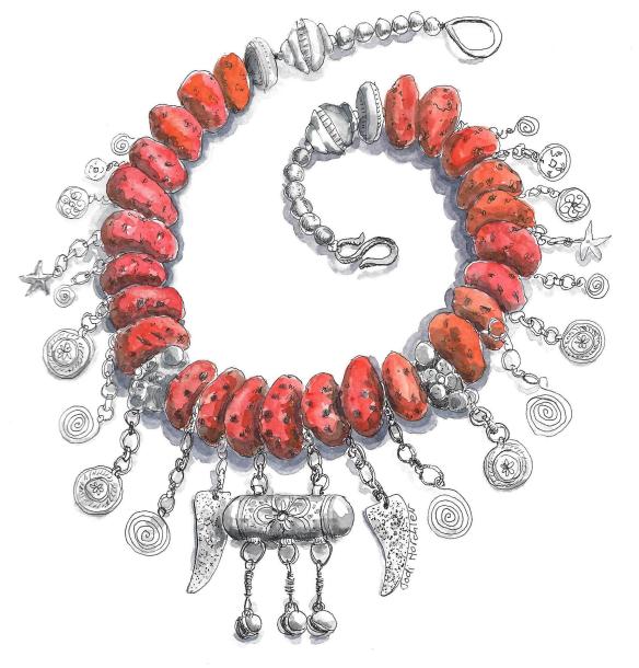 I’m going to get back on track, I swear! Because life is more fun when I’m always working on art. And I get so disappointed in myself when I’m not. Here is a drawing I worked on, off-and-on, for a while. Watercolor and pen on paper. Lots of time-consuming detail and I’m not sure if it’s finished. This is one of my favorite necklaces. Love the color and how chunky and exotic it looks. Yes, it’s a bit heavy and a few strands of hair usually get caught in it but so worth it. It makes me feel like I’m an interesting person when I wear it. I guess I should be rocking that thing every day!