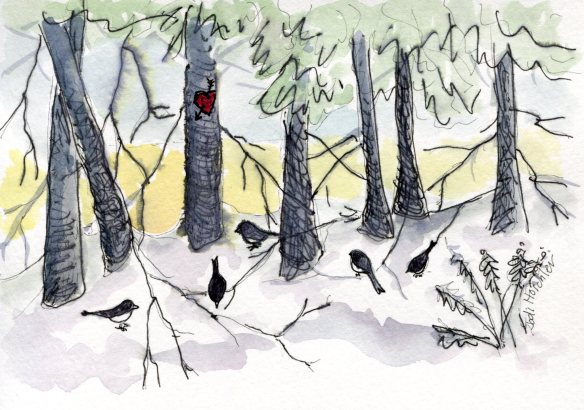 This was supposed to be a Valentine’s post but…I don’t know what happened. So now it’s a happy snowy March post. It snowed 5 inches last night and today, so pretty coating all the branches. We’ve had a lot of juncos in our yard this winter, at the feeders and hopping around on the ground and under the hedges. They are in the sparrow family I only recently found out. Such cute little plump birds–so neat and tidy looking with their soft charcoal-gray feathers, white bellies and small pale beaks. Makes me think of gray flannel suits. They seem so fearless. I think the little black cat I’ve seen lately in our yard likes them too! Danger! Danger!