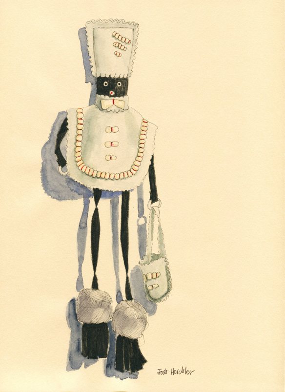 This guy–I think it’s a guy–is meant to hold sewing items. The felt shirt flips up for needles to be stored in a piece of flannel, there are little skeins of thread around the ankles, and his tote holds thimbles. The right tote is missing but maybe it had tiny scissors in it or a wee pin cushion. I love stuff like this, sweet and charming. Maybe these things were little projects for learning sewing and embroidery techniques or just useful if you didn’t want to lug your sewing basket with you. I used a micron pen and watercolor on pastel paper. Had a little trouble with the shadows but it was still fun to draw and paint. It was also fun searching for these online when I was trying to figure out what to call it. Sewing “caddy” brought up wooden holders and vintage “etuis” are beautiful little ornamental cases which I especially enjoyed perusing. “Needle holders” was the most commonly used for these but I liked the British version–“needle minders.” I squandered some serious time in the name of research. Just for you.