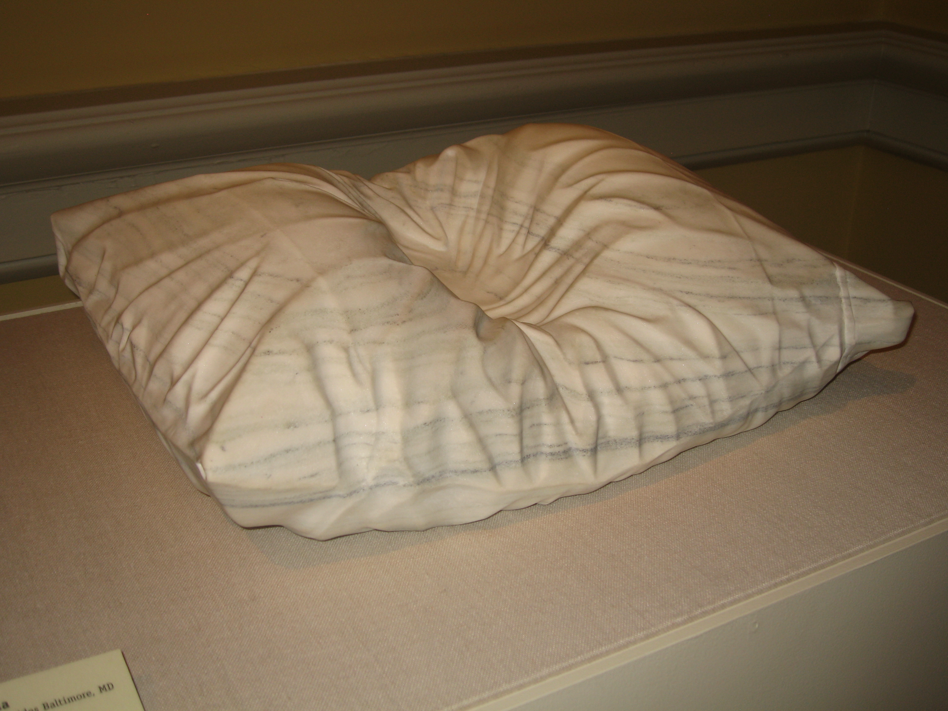 So let’s see.. we all know about Cinderella’s glass shoe but did you know there’s a glass dress? Yes, there is! It’s called Reclining Dress Impression with Drapery by Karen LaMonte and it’s gorgeous. It rests on a white pedestal in the center of an octagonal room with dark red walls, high ceilings, tall skinny curtained windows and an elaborate chandelier. The room itself is impressive and the perfect setting for Karen’s dress.