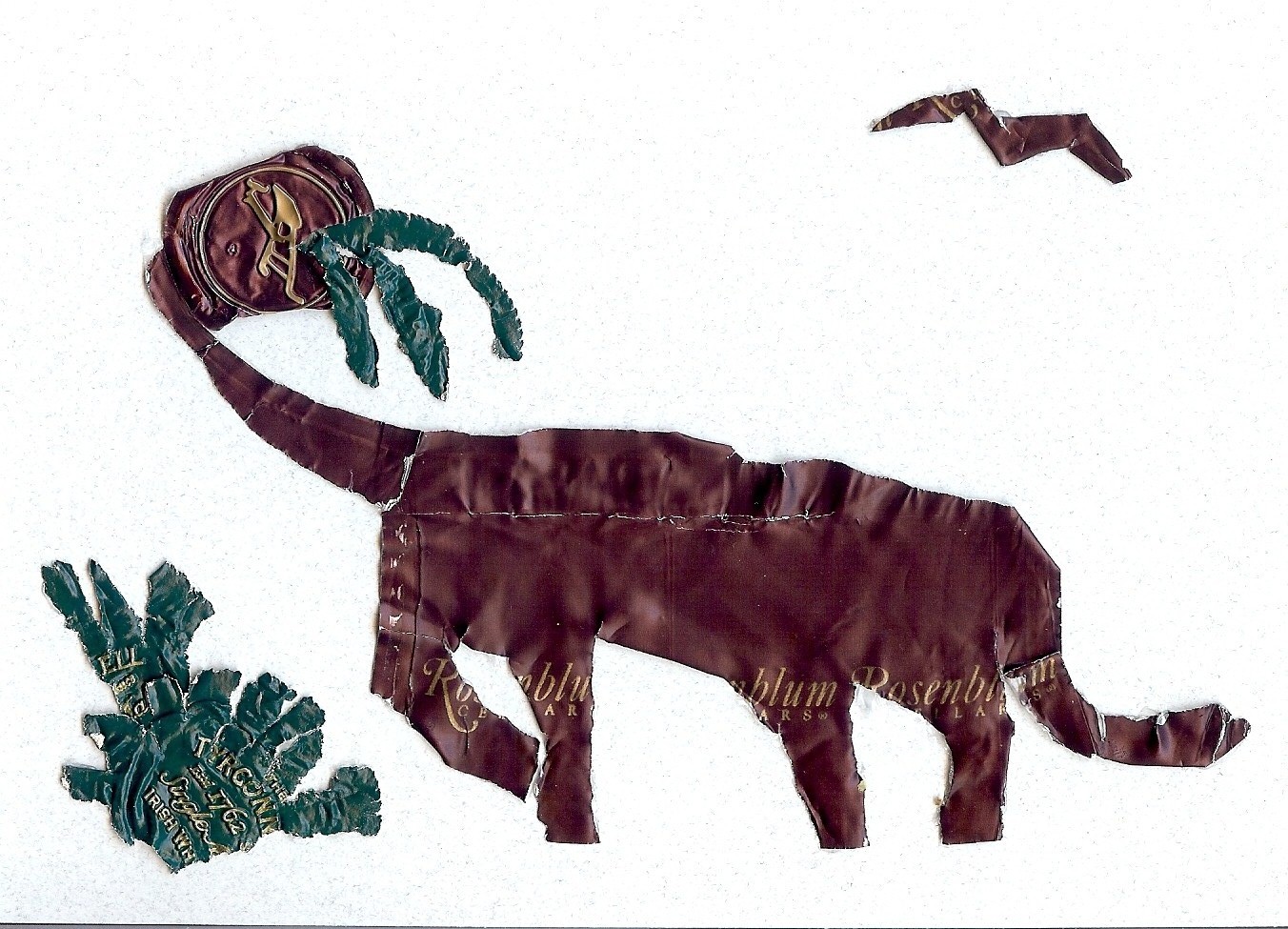 For years I’ve saved the lead wrapping on wine bottles because it’s so much fun to fold, tear, and make pictures with. Sometimes when you are limited to just a small bit of material to make something with, it’s easier to create and it’s fun and relaxing. Kind of like doodling.