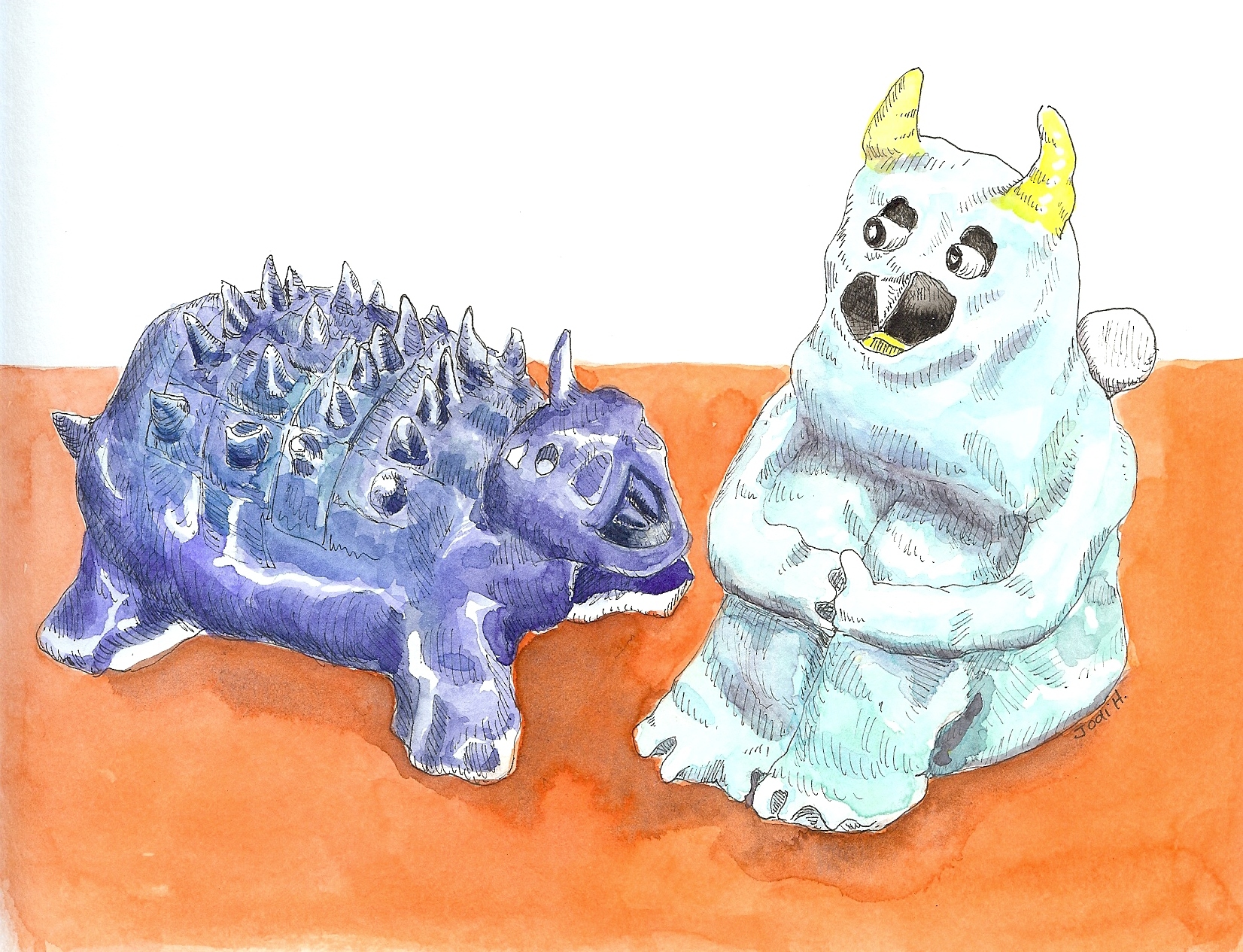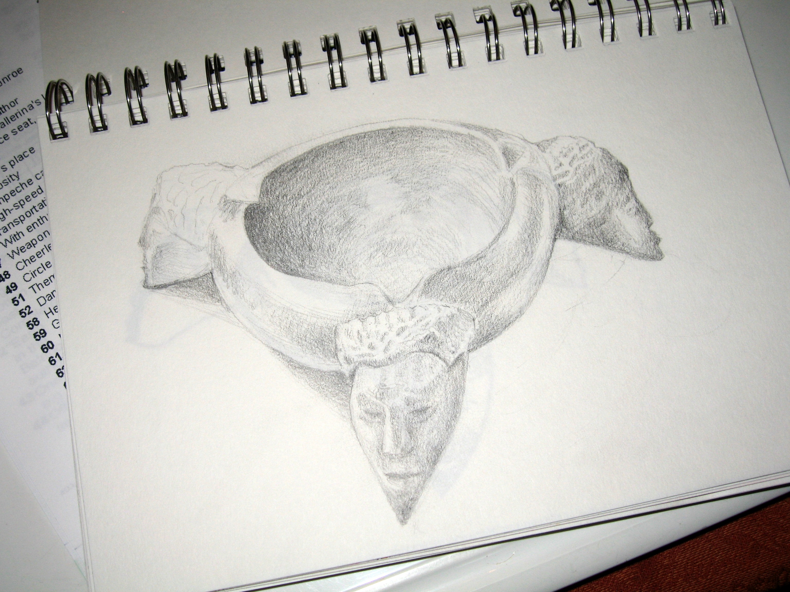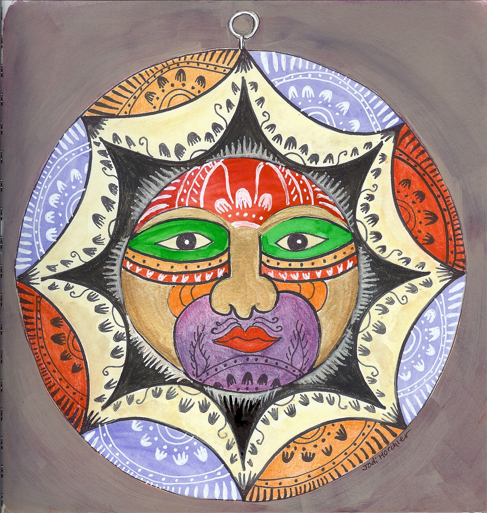 Drawing it was the easy part. Painting it was time consuming and a bit tricky and I had a real problem with the background color. Tried two different shades (too light, then too dark) and the paper was getting pretty beat up and warped so I ended up covering it with acrylic paint and that will have to do. The nose, cheeks and eyebrows are metallic gold paint which doesn’t show up in the scanned image. My rendering looks rather flat unfortunately when really the head part is slightly domed. I thought I could do some shading after painting but then was afraid of ruining it after all the time spent. So I have some learning to do. No big deal. This guy just exudes power, doesn’t he? I feel powerful. Now you can too!