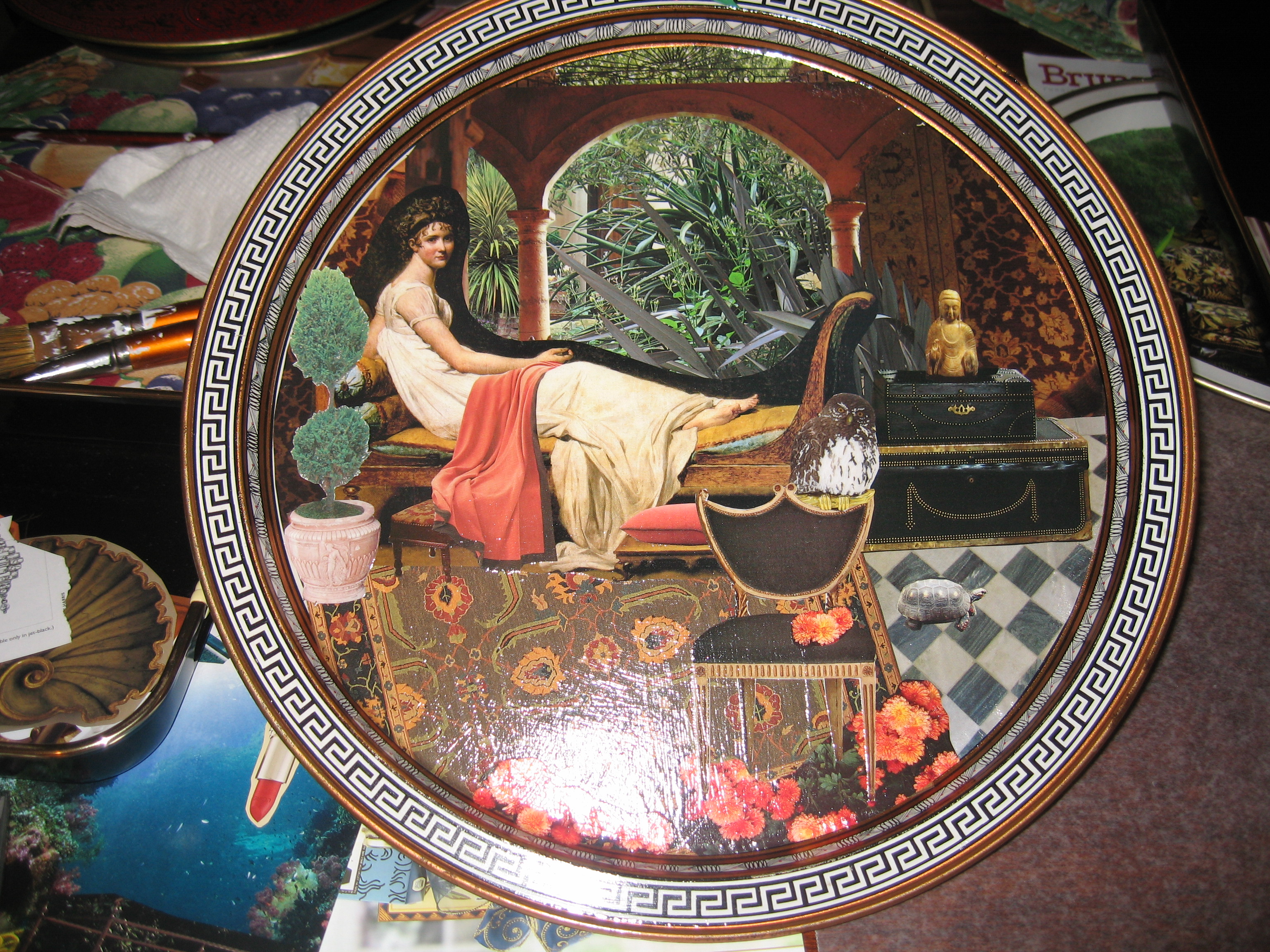 Here is another of my decoupage trays for you to look at while I decide what to sketch next. This one was built around a magazine photo of this portrait of Juliette Recamier by Jacques Louis David in 1800, which I loved. I wanted to create a room for her with one of those open air courtyard gardens so I could use the pillared archway I had cut out and I also wanted to include the interesting black chair (dang that flash glare). I think those were the three things I decided to start with. And of course lots of leafy plants! The tiled bit of floor and the Persian rug begged to be in it too once I saw them. Not very noticeable is the fluffy owl perched on the back of the chair and the tortoise on the tile floor. Just talking about the scene makes me want to start cutting and pasting! So much fun. WHY am I not doing that now, again? Oh right, the mess.