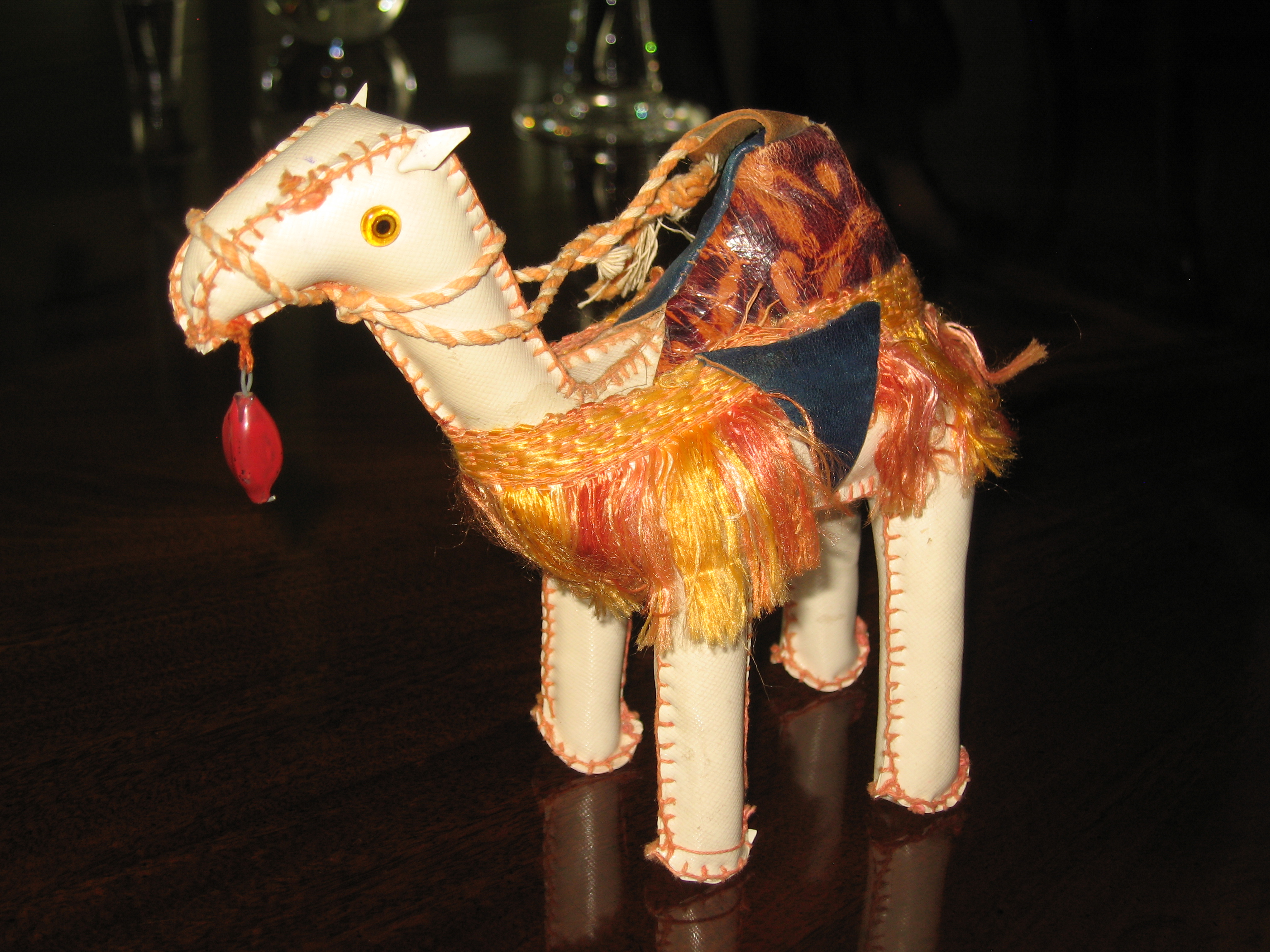 Side note–check this out. My friend Laurie saw the April 30 post of my vintage leather camel and it looked familiar–turns out she has one just like it except white leather with orange fringe instead of tan with cream. What are the odds of that? Hers looks brand new though. Mine has lost his red bead. And his youthful gloss. It’s OK.