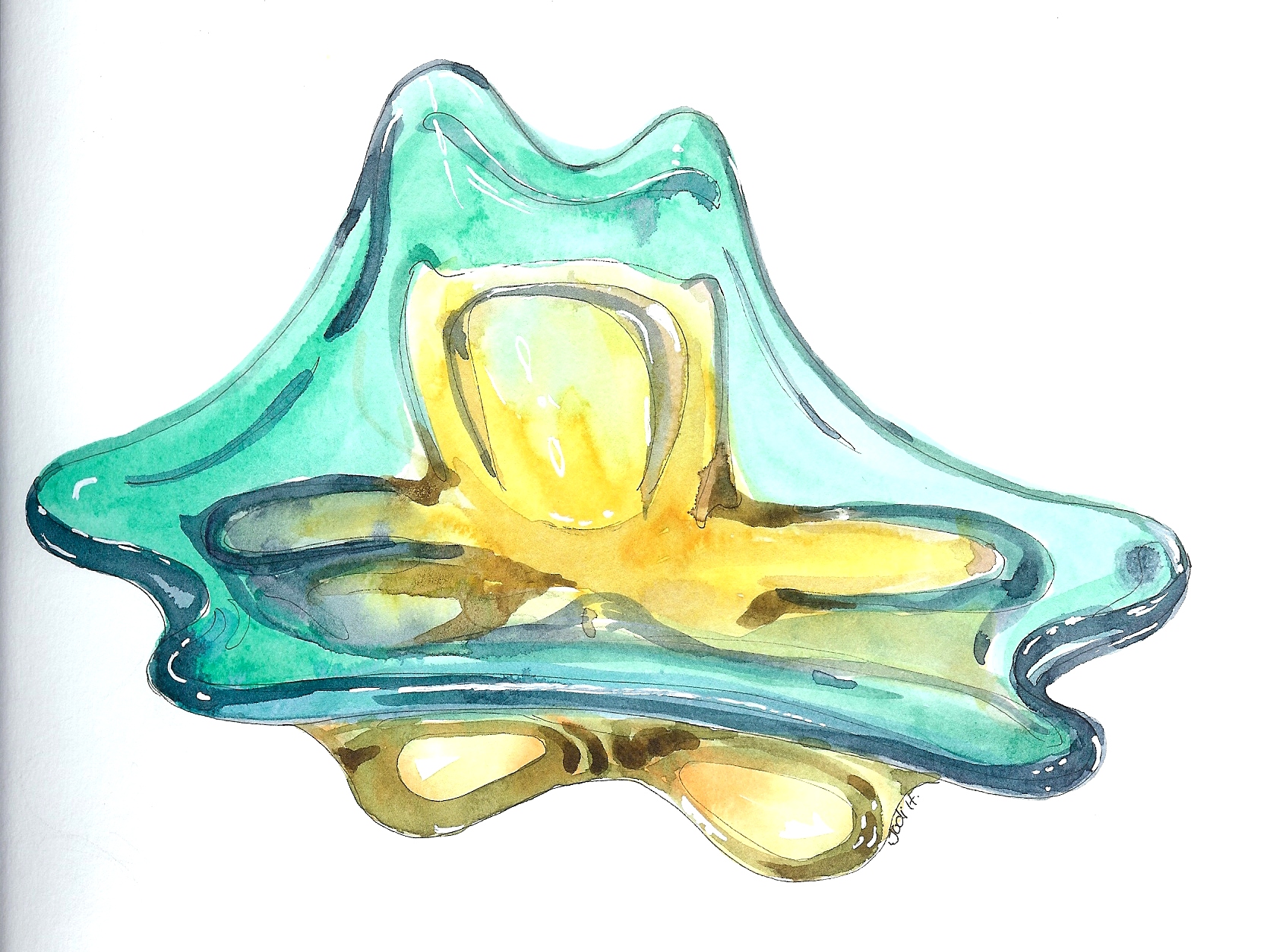 Glass is tricky to draw and paint. I decided to leave well enough alone and not try to do the lovely but complicated cast shadows. My stupid fear stomped all over my fierce determination. Maybe another time when I’m feeling more confident. This is a gorgeous glass ashtray that was in our house when I was growing up so it was probably acquired in the late 50s or 60s. Heavy and smooth. I don’t know where it came from. Maybe my parents remember. I like to think it’s Murano glass from Italy. But probably not.