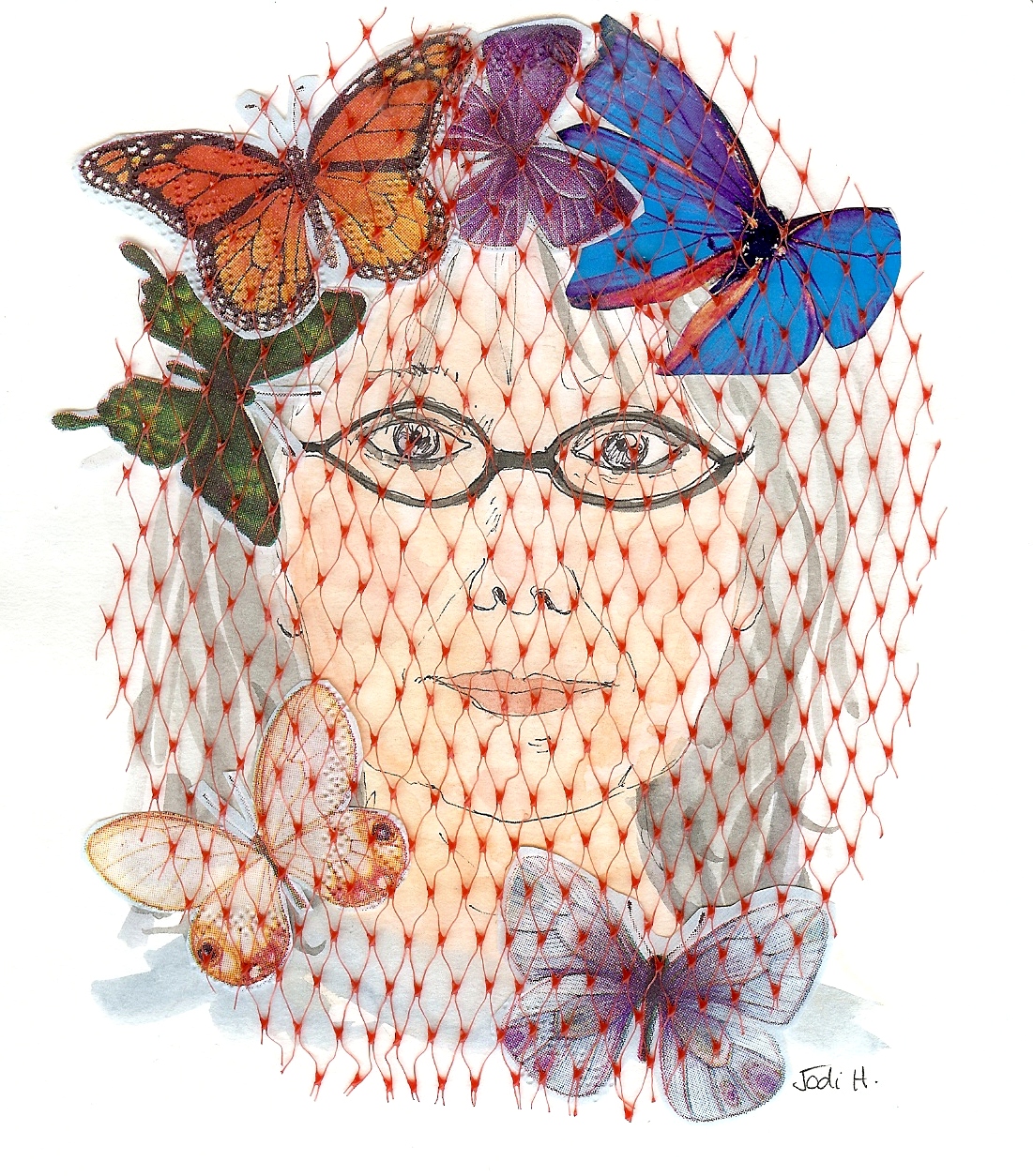 Well. Self portraits are mighty hard. Especially the noses. And Rich says “She looks older than you.” Perhaps. But you have to keep on drawing faces in order to have any eventual success at it. Why does everything have to require so much practice? Anyhow, I do like the butterflies which I cut from a fancy cocktail napkin. And the bright blue one from a magazine. They give your eye something pretty to rest on. And the produce bag netting has a softening effect. I saw a line somewhere (don’t know the source of the quote), “Leave everyone wondering which is more interesting, you or your hat.” In this case, it’s definitely the hat!