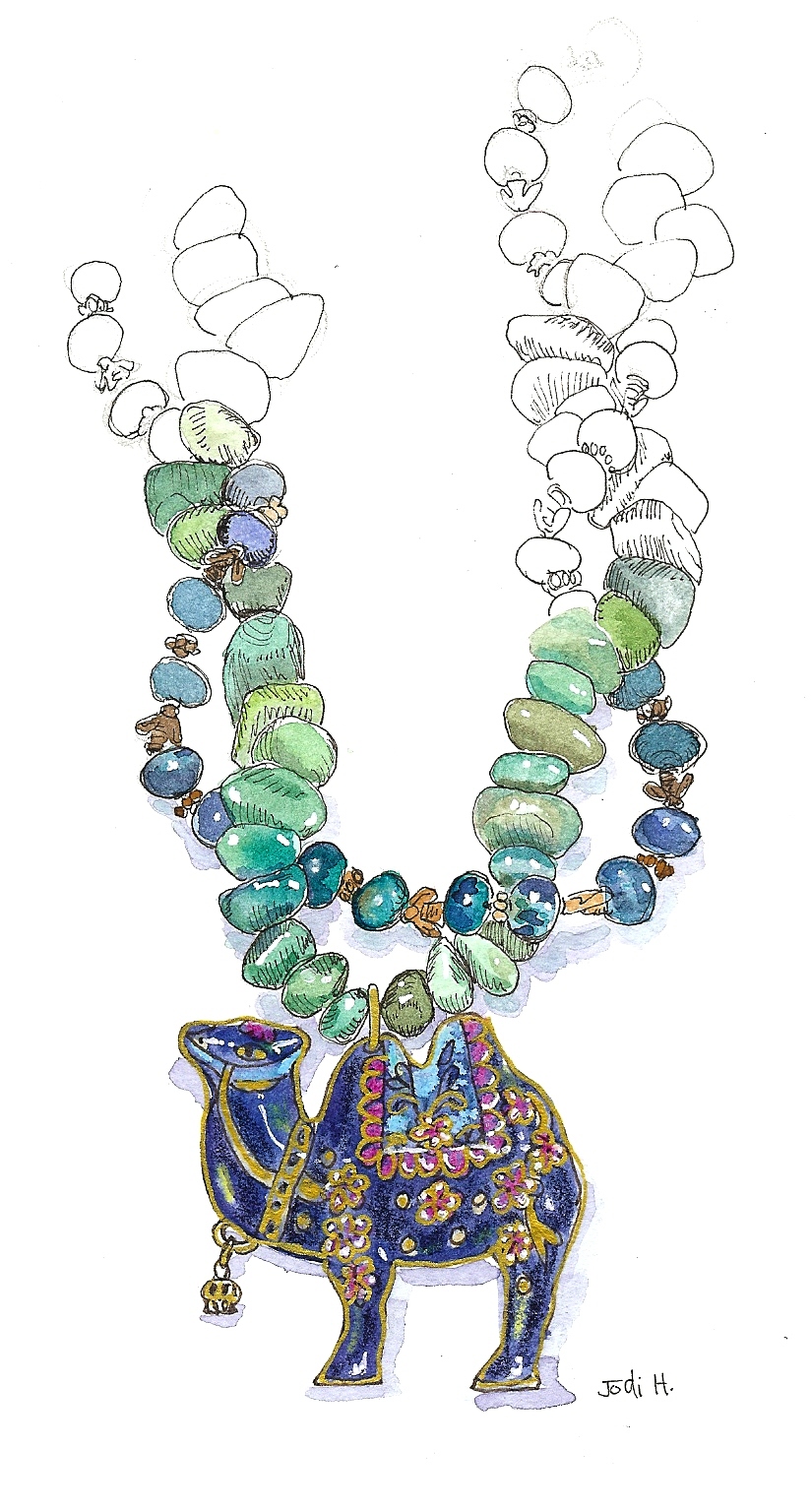 A while ago, back when I was sketching the camels, I started this drawing. But I got frustrated and gave up before even starting on the stone and ceramic beads. I figured I’d get back to it another day. Today is THAT day. This time I enjoyed it. And I kind of like it unfinished this way to show the progression of the art work. Hmm…The green stone beads on the right look better than the ones with all the pen marks. Rats. I keep doing that. Can’t leave well enough alone. Anyway, I found this nifty pendant at an antique shop hanging on a plain ol’ ugly chain. I thought he deserved something fancier so I put together this double strand which I think suits him much better. He’s about two inches wide and two inches high. Enamel on brass. So colorful and exotic! I’m keeping an eye out for more of his kind.