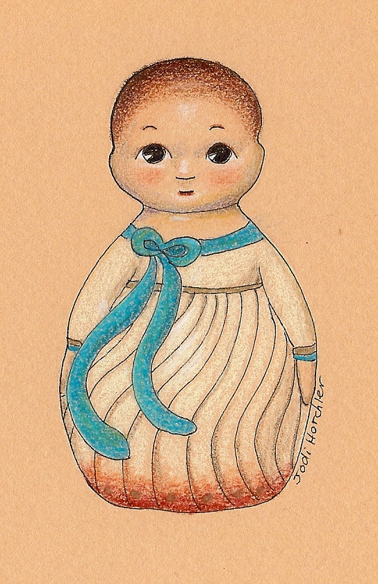This sweet-faced dolly actually has a little plastic pencil sharpener inserted in the back of it which makes it utilitarian as well and cute as heck. She’s about two and a half inches tall. Painted ceramic, I think. I thought she looked like Mexican folk art or possibly European but I did a search online and the only vintage pencil sharpeners that had a similar look were from China. So there ya go. Probably had a sticker at one time which is gone. I used colored pencils on tinted pastel paper. I like the warmth and not having to apologize for a muddy background wash!