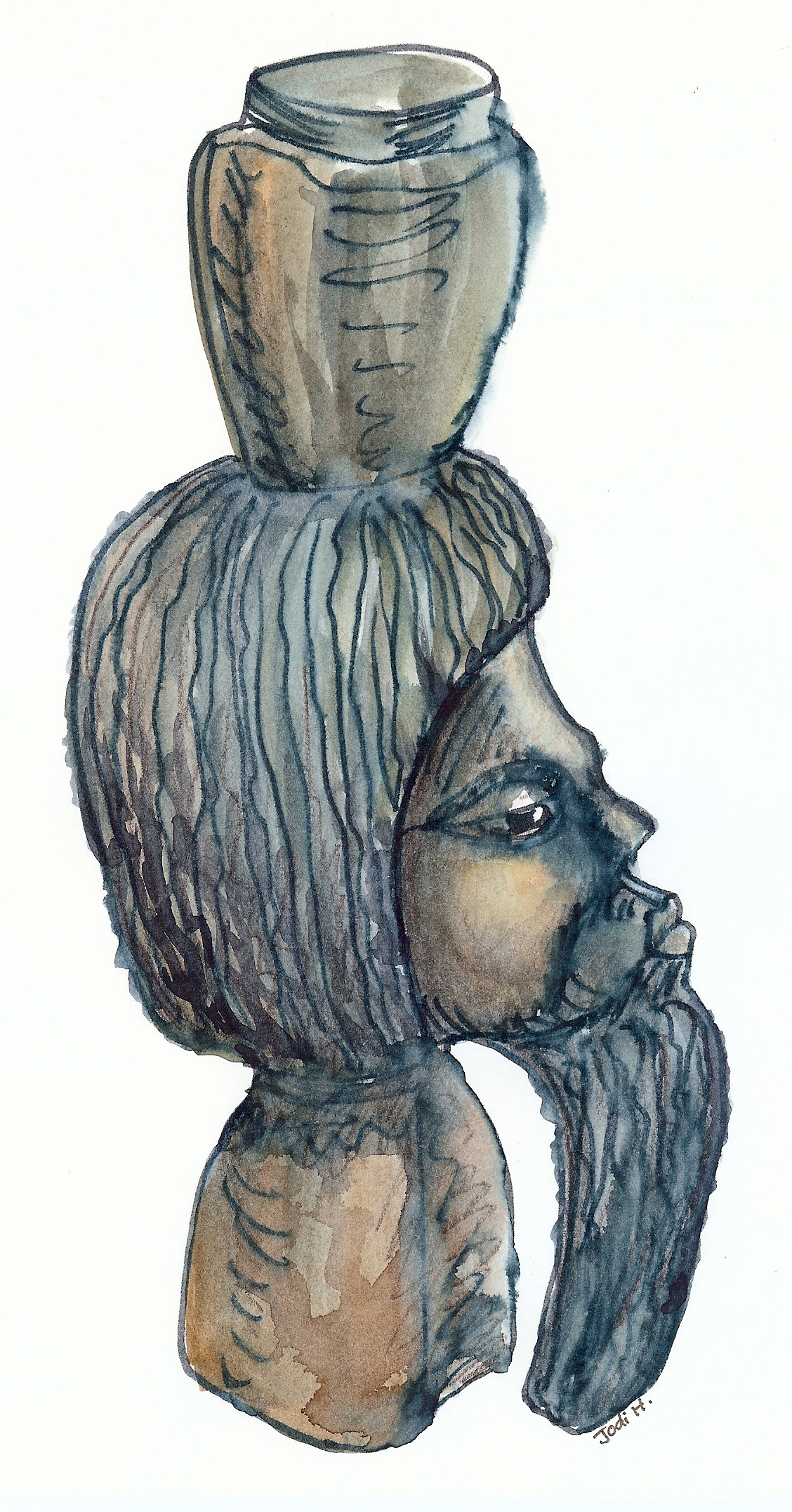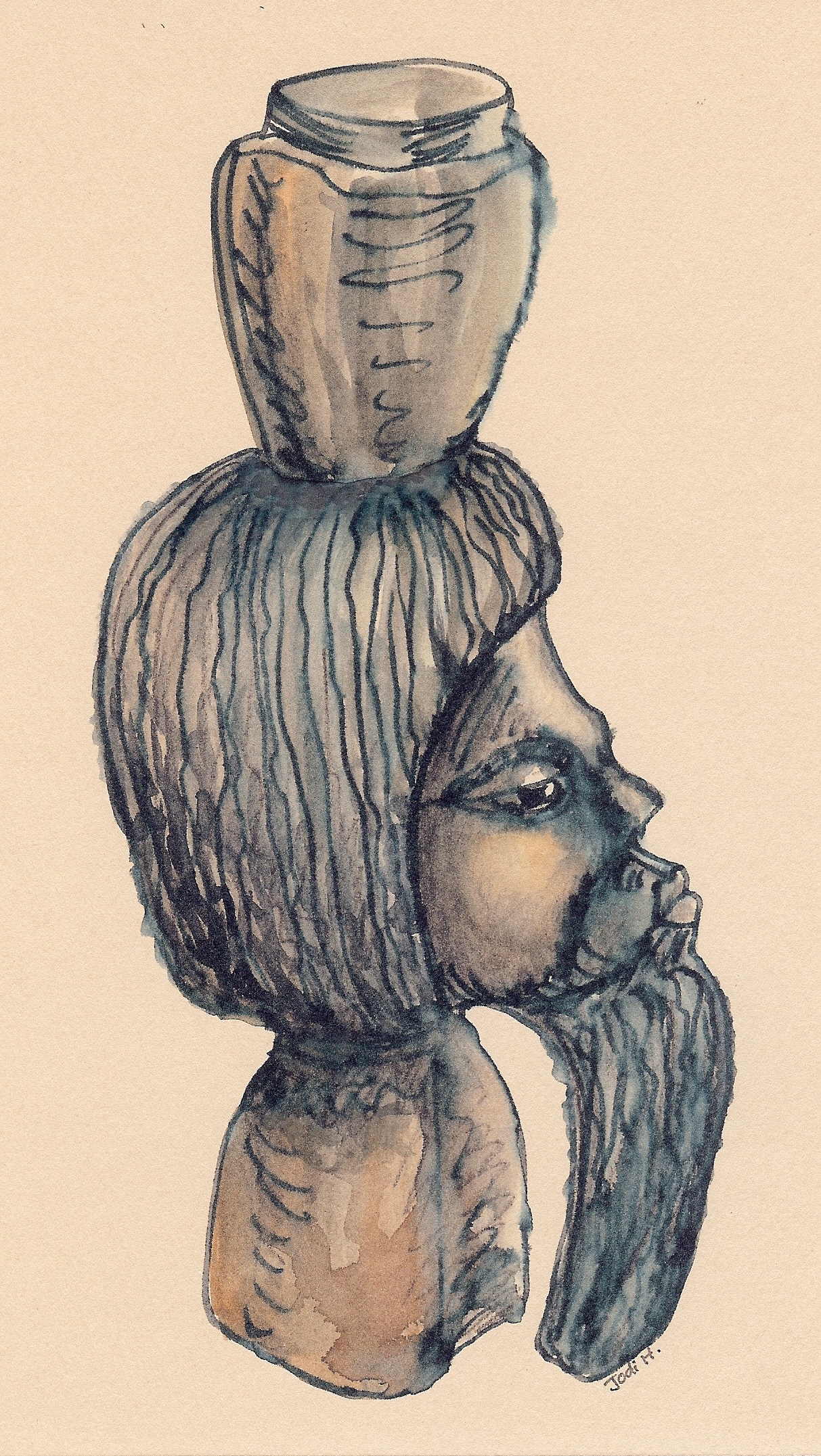Here’s THIS guy. I wanted to draw something less painstakingly detailed, and in a loosey-goosey style for a change. This was a quick sketch in marker on card stock printer paper. Then I made a copy to work on with watercolors, because the printer ink isn’t waterproof and I wanted it to be a bit runny. When I was done I printed a copy on the tinted Canson paper just to see how that would look, and I like it (see below). But I thought I’d go with the white background since I’ve been using that tinted paper a lot lately. This wood carving is 12 inches tall and heavy. Most likely he’s African. Or possibly Caribbean.