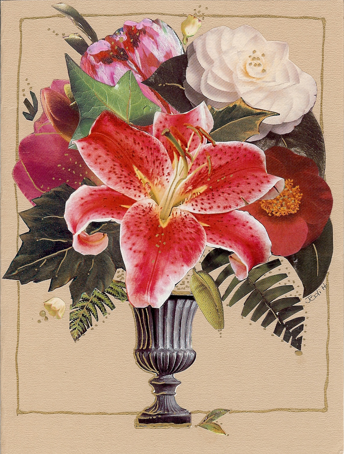 Here is something colorful to look at. As I’ve said before, I love to cut and paste. There’s nothing like having a pile of glossy-paged magazines and a sharp pair of scissors at hand. A jelly donut and cup of coffee comes close but well, that’s a different kind of delight. This is just leaves, flowers and an urn that I cut from decor and garden magazines, glued on card stock and embellished with a gold metallic pen. You can do this! I call it paper therapy.