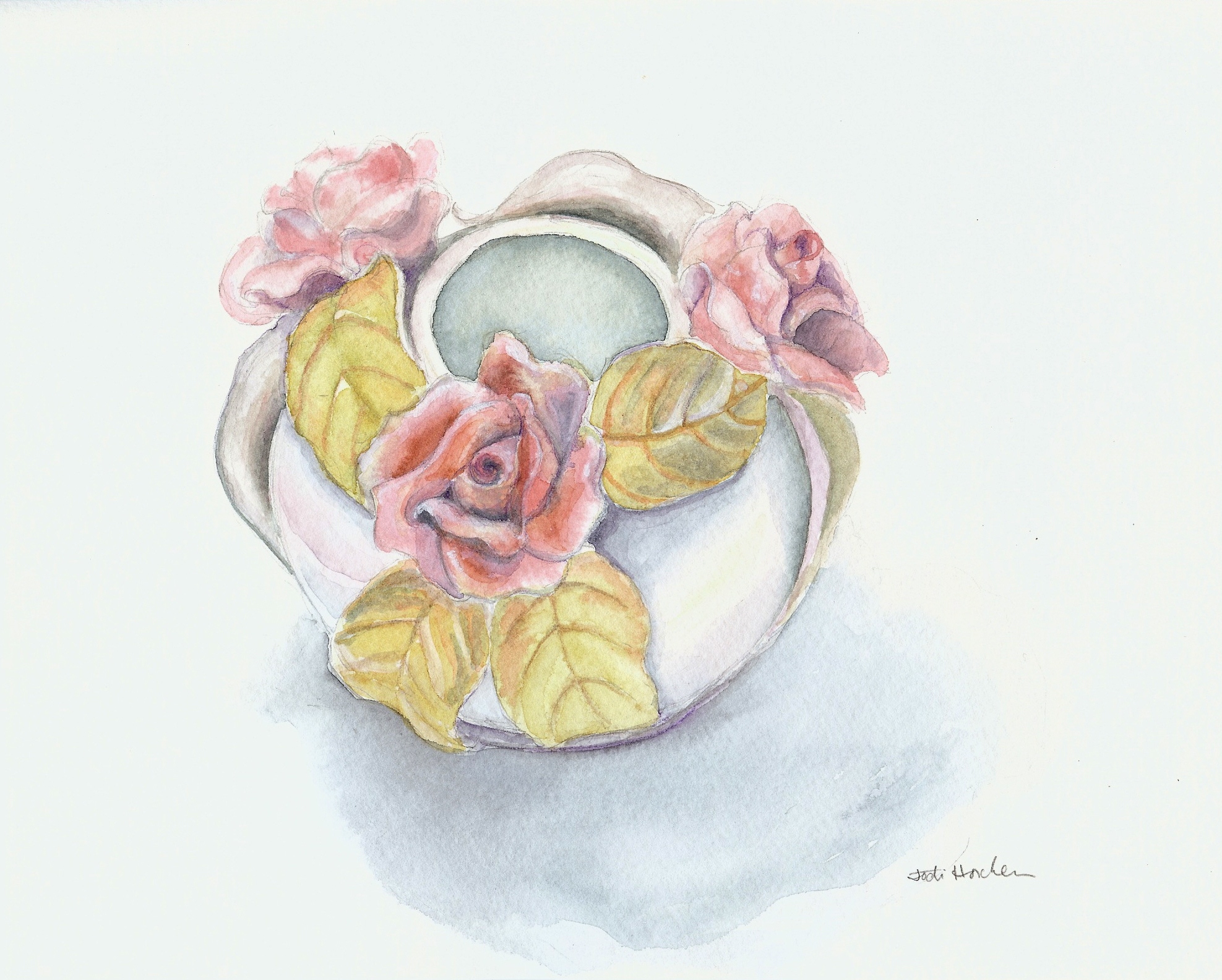 A couple of weeks ago, I was feeling antsy and irritable and I realized I was having THRIFT STORE WITHDRAWAL–so I just had to go browse in one. That’s the only solution. Aside from browsing in more than one thrift store, which is what I did. Good thing because I found this sweet little bowl for two dollars. Perfect blog subject. It’s about 4″ tall and 6″ wide with a super smooth, glassy surface which I just could not manage to portray. It was a challenge–both to draw and to paint–which I would like to try again maybe after I watch some tutorials on painting reflective surfaces. The other thing is when I scan light watercolors like this, the scanner bleaches out the colors…it just doesn’t register the light tones. I tried manually adjusting to enrich it which helped– actually the color is richer here than in both my painting and the vase, which now seem a bit faded. I know, too much information, huh?