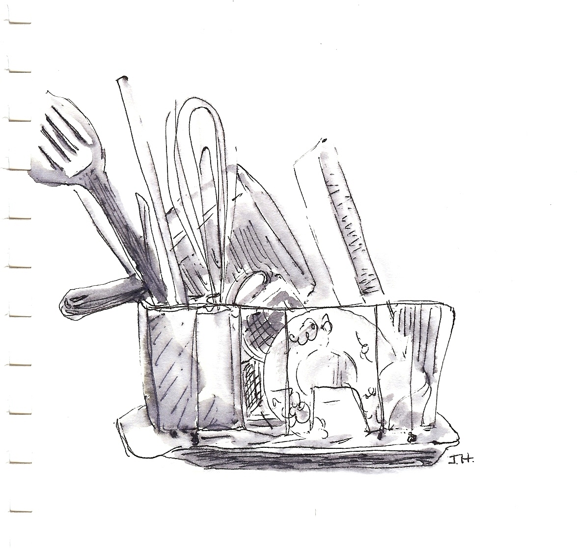 Here’s a quick sketch I did in the kitchen recently. Emptying the dish drainer is one of those chores I tend to put off until it’s become a precarious situation. Do I live on the edge or what?