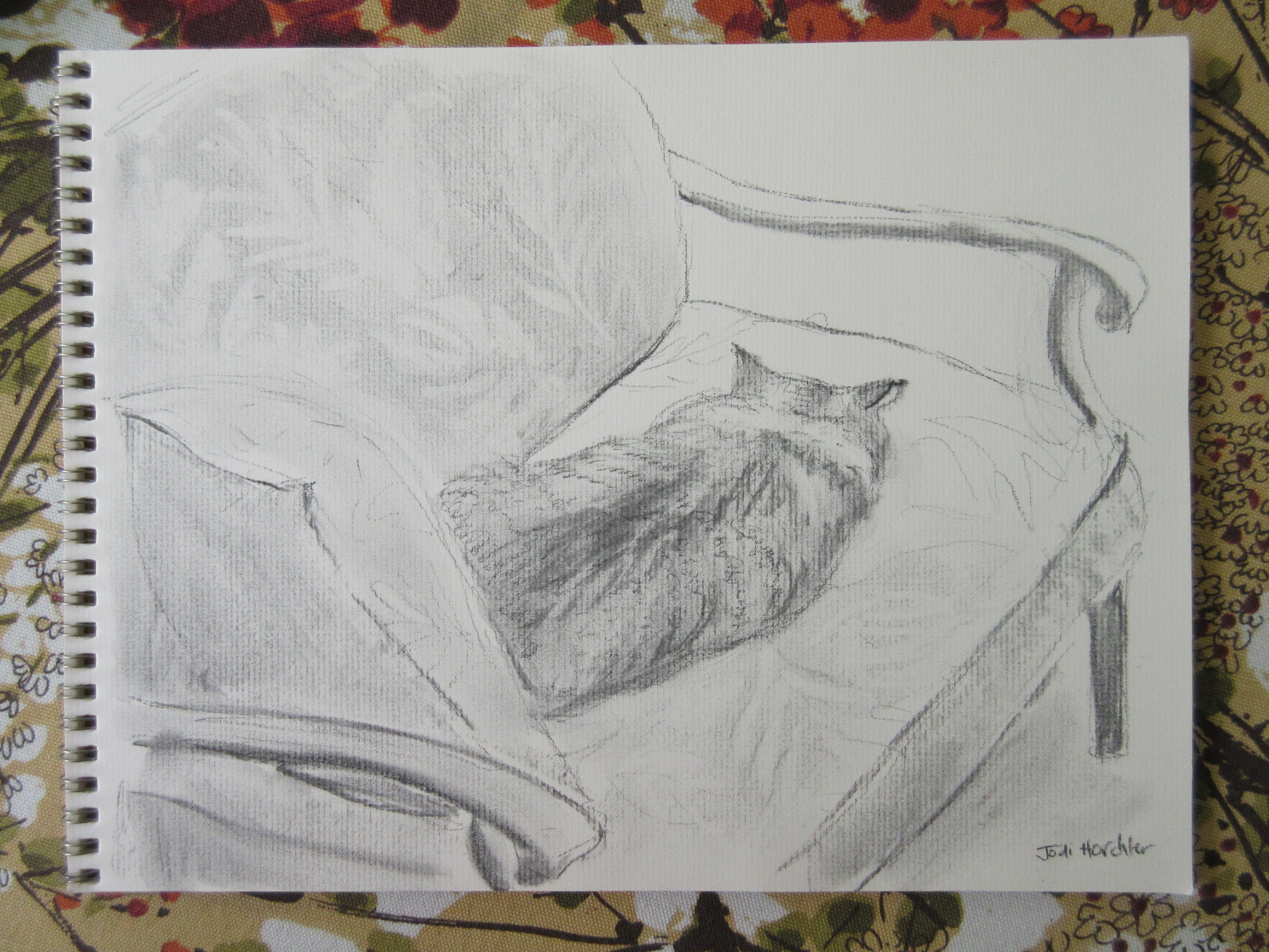 The charm bracelet painting I am working on is not coming along swimmingly. So in the meantime here is a charcoal drawing of Stardust–the best cat in the world–who belongs to Jill next door. Sweet, sweet kitty. She lets us pretend that she’s our kitty too. And we let her pretend that she owns our yard, the back porch, the bird feeders and all the birds.