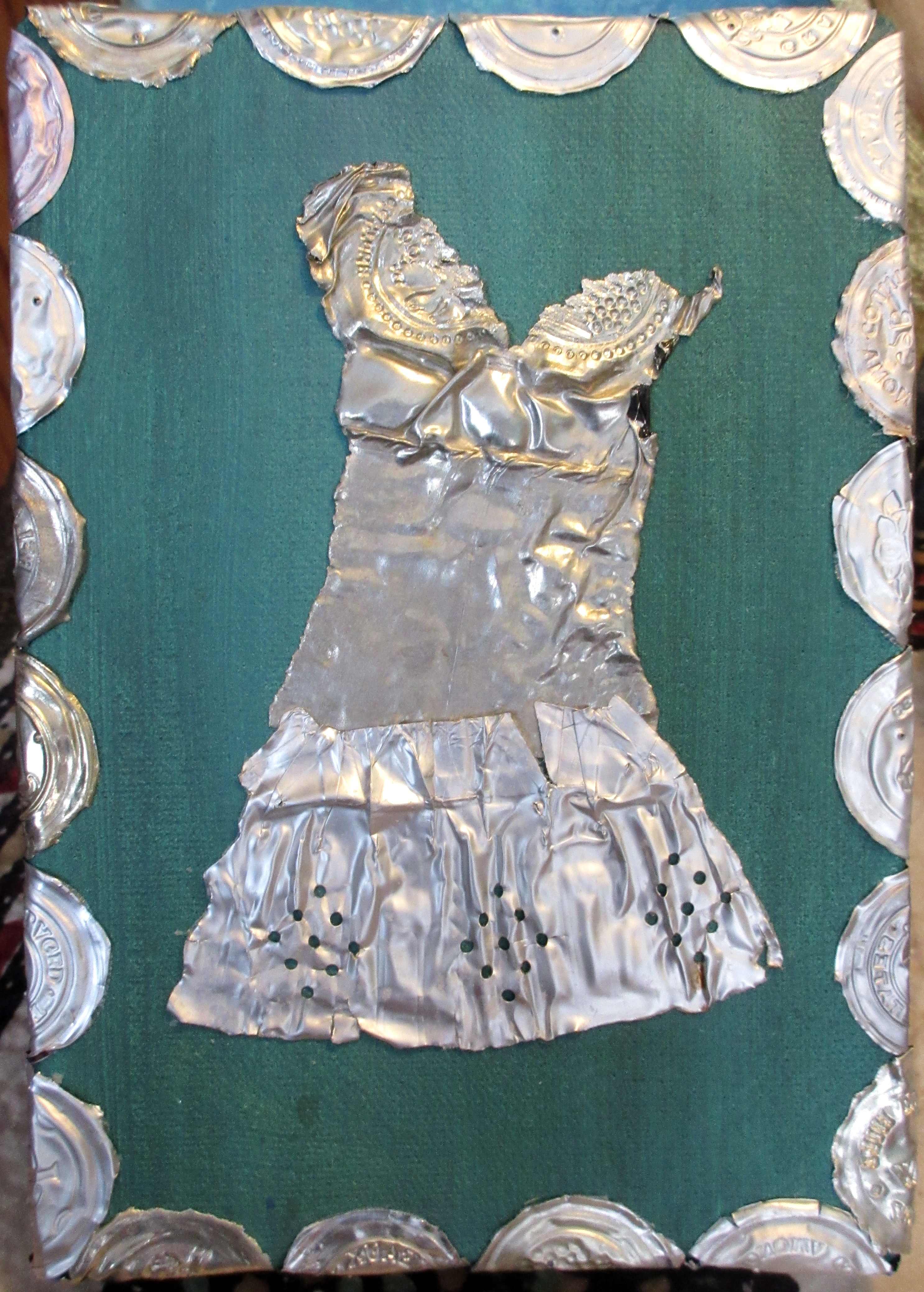 I was digging through my shoe box of wine caps and messing around with the lead foil. It’s like doing flat sculpture. I manipulate it until it reminds me of something and then go with that idea. I do wash my hands a lot after playing with that stuff. And I had this 5×7 canvas–the perfect size for the silver dress. I am especially pleased with the round cap border wrap. Makes me want to do a whole wardrobe of foil outfits and accessories. With scalloped borders. I loved paper dolls as a kid too.