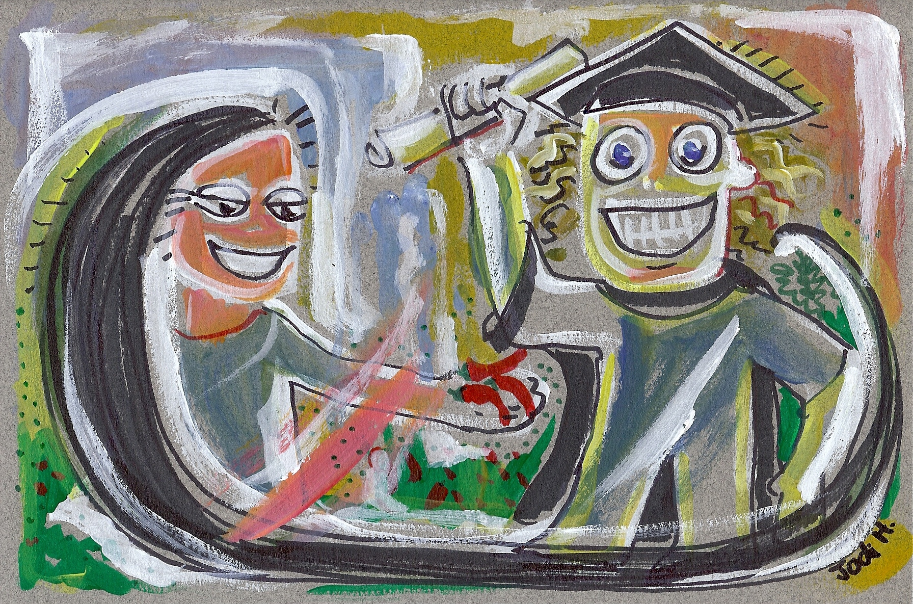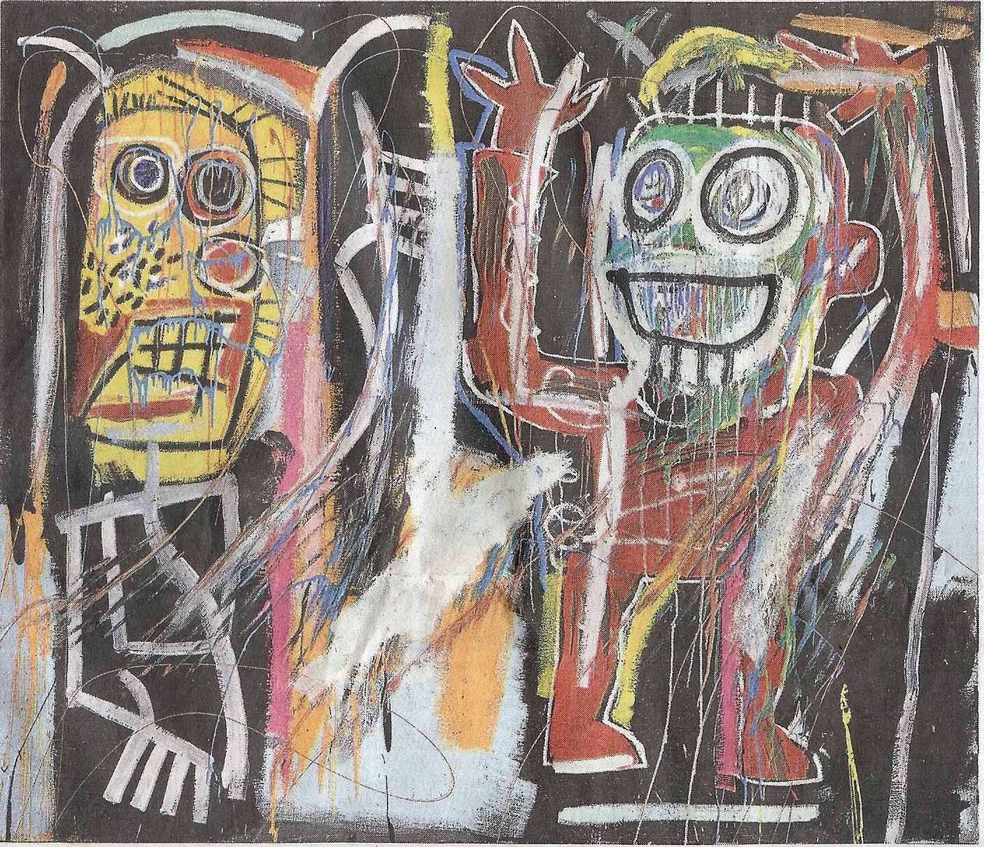 We spent a few fun days with Spence and Tuyen for his Masters graduation festivities and I made a card for him the day before we headed there. I was flipping through one of my decor books and saw a picture of an art collector’s apartment with a large Basquiat painting on the wall. Using that as my inspiration, I did my own version of his wild graffiti style using acrylic paint and markers on paper. It was a lot of fun. And then, two days after I made this card, the Wall Street Journal had a photo of the Basquiat painting I was inspired by on the front page of their business/finance section. It’s called “Dustheads” and it just sold for $35 million! Funny coincidence. Here’s Jean Michel Basquiat’s painting below: Such a startling, aggressive and exuberant style. I’m intrigued.