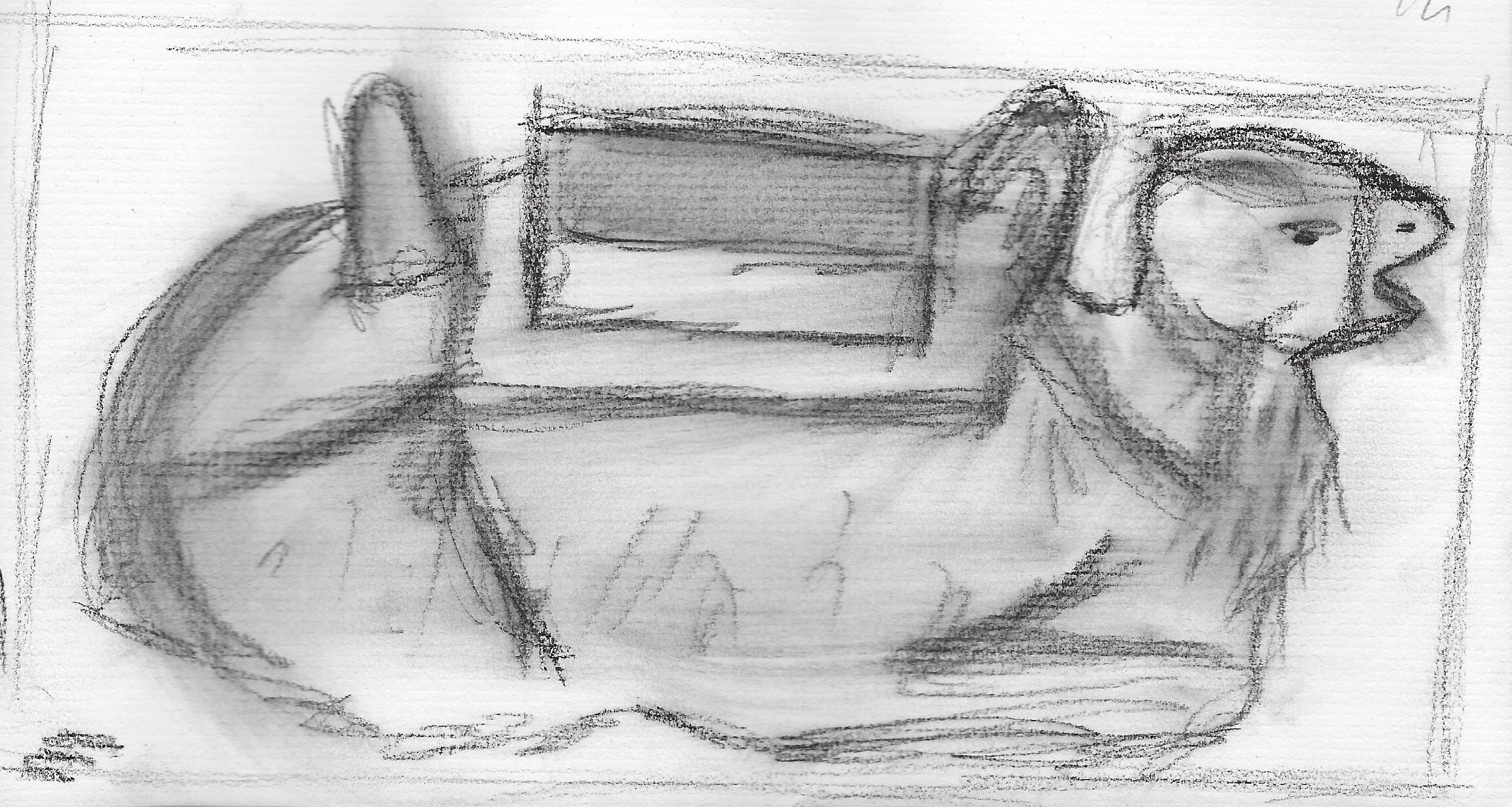 One weekend when Sam was here he suggested we draw together, doing timed ten minute sketches. The object was my choice, the medium his–charcoal. It was so much fun. I may have gone a tad over ten minutes but not much. This ceramic camel is about eight inches long and three and a half inches wide and I guess it’s meant to be a tea pot or creamer since his mouth is a spout. It probably at one time had a lid. But matching lids to things are in short supply in thrift stores. He’s charming, though, don’t you think? Definitely fits in with my curios.
