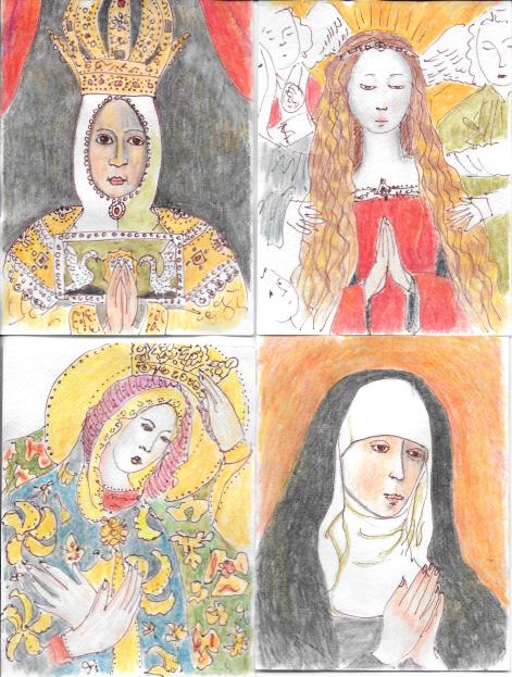 And now for some-thing completely different. I found a three-by- four inch notepad of hand-made paper and wanted to test it out. So I drew quick sketches of some favorites from the large book I have of Mary throughout the ages, as painted by different artists. I used a micron pen and then watercolor pencils for color. Fun little studies. Certainly less somber than the originals. It’s interesting to see how Mary has been depicted through the ages. Sometimes humble and kindly and other times in armor and with a sword. Pretty bad-ass. Well, she had a stressful job.