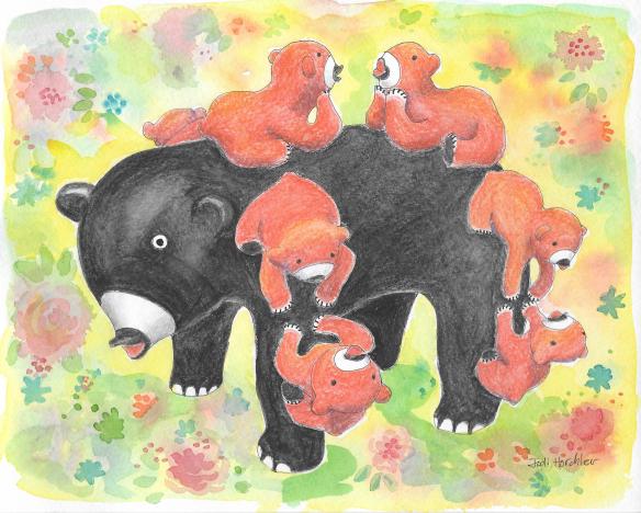 Here’s a belated Mother’s Day post. I drew this piece from a photo I took of a clay sculpture at the Smithsonian Museum of American Art in D.C. It’s in the glass cases that serve as their visible art storage system. Louis Naranjo is the sculptor and he was from Cochiti Pueblo in New Mexico. He did a whole series of storyteller bears and this was his first. You can google him and see lots of photos of his wonderful clay bear sculptures. It’s smallish–about six by nine inches as I recall. Very sweet. I used watercolor pencils and am not happy with how the black bear body turned out, flat and streaky. Probably regular watercolors would have worked better for me–which is what I used for the background. Wanted to share it anyway. She looks a little dazed. Kids.